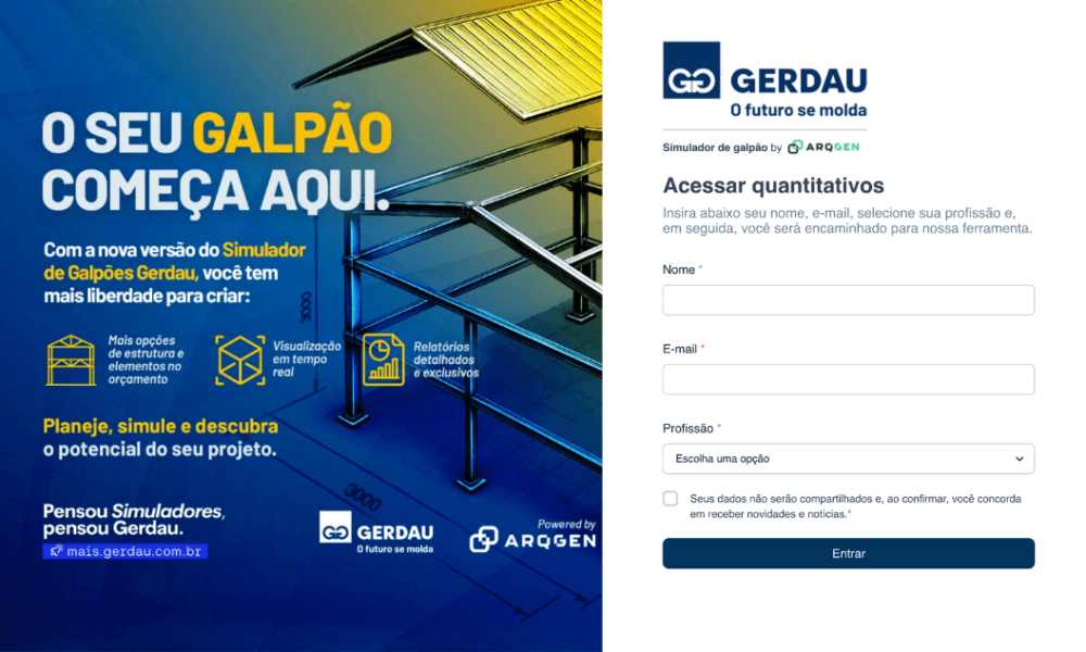 O Simulador de Galpões Gerdau, desenvolvido em parceria com a Arqgen, está disponível gratuitamente na plataforma Gerdau Mais – que reúne recursos de autoatendimento e apoia o desenvolvimento da jornada de compra de produtos e serviços da companhia no Brasil.